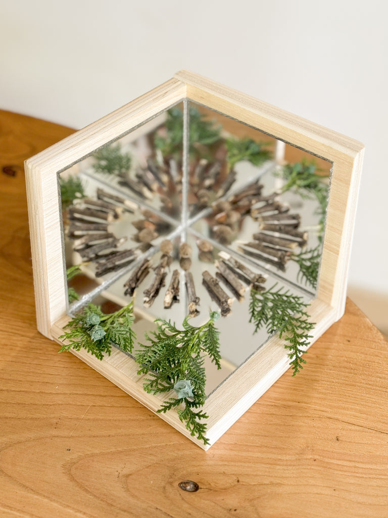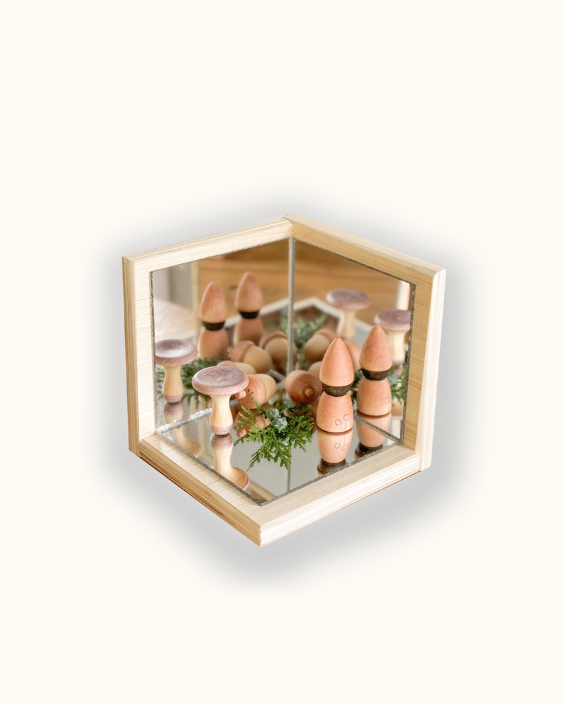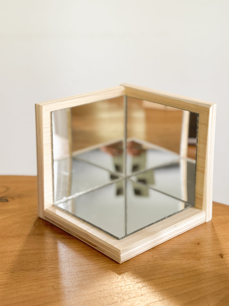 Compuesto por dos paredes y un suelo reflejante (espejo acrílico, apto para uso infantil) se forma una cajita en dónde se pueden poner objetos que se reflejarán en todos los sentidos. ¡Los peques podrán usarlo para jugar, descubrir y aprender!